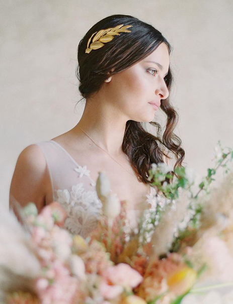 Minimalistic yet impactful, Misho Designs’ hair accessories celebrate the beauty of rough crystals and metallic glimmer with hair accessories that strike a delightful contrast against brunette hair.