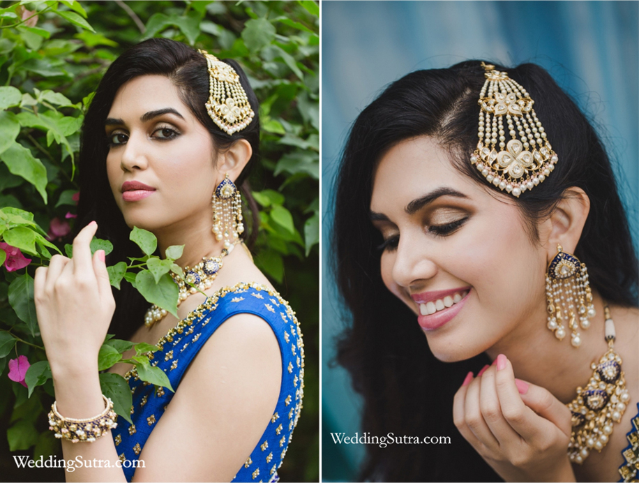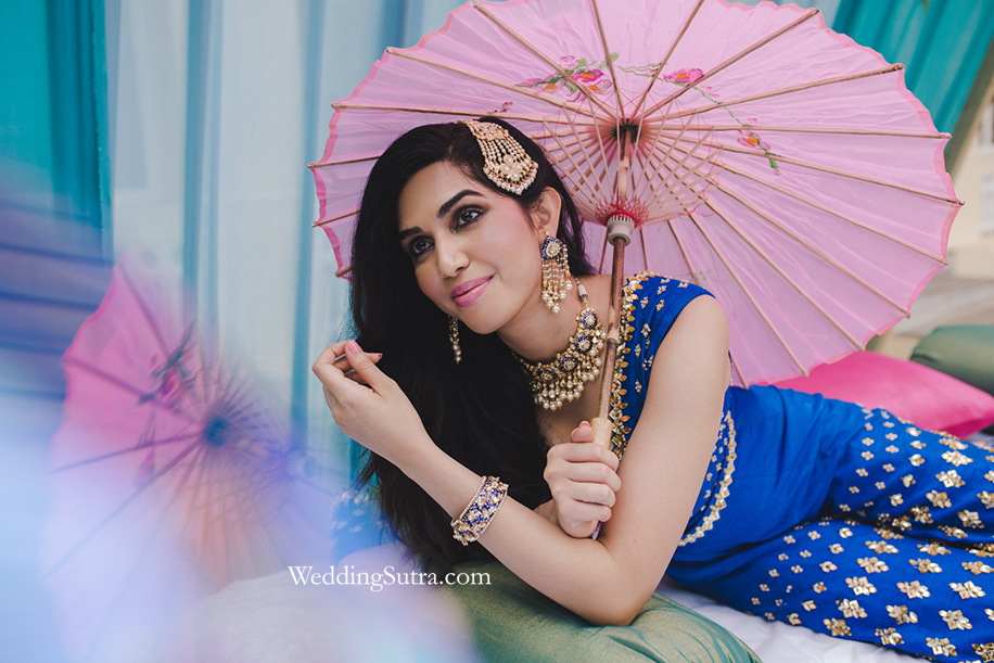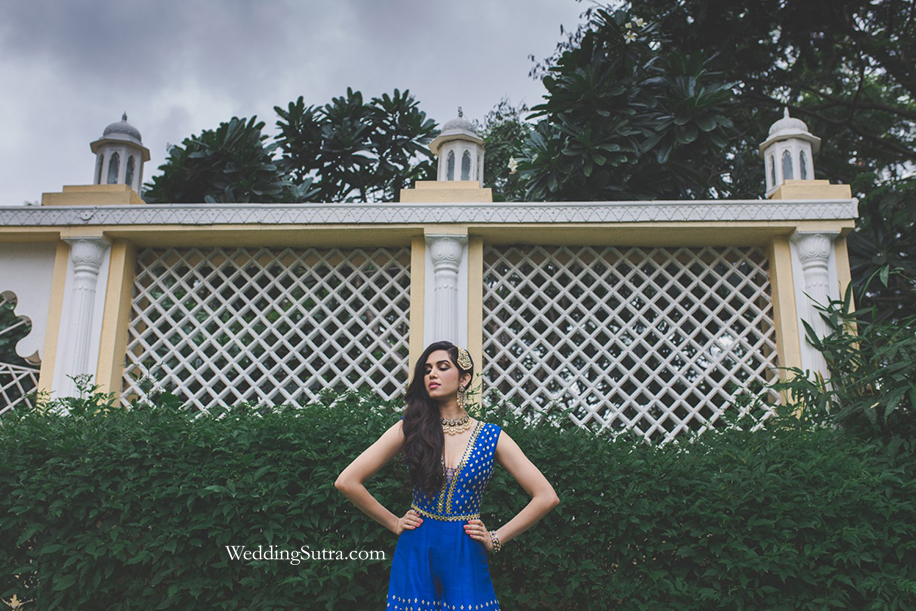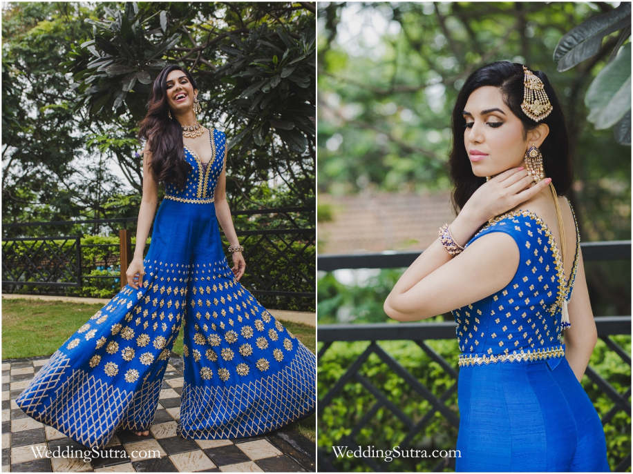The mehndi is that one chance for the bride to be as experimental as she likes. We styled a bridal look that began with this Persian blue silk jumpsuit complete with laser cut golden acrylic embellishments. A twist came courtesy a set of traditional jewellery; a kundan necklace set from CH Jewellers. The piece fuses blue enamel work with uncut diamonds and pearls. The handcrafted passa made for an unlikely but beautiful addition to the mix and brought a more profound Indian dimension to the look. With deep smokey eyes balanced by light pink lips and a touch of flush, our model was ready to step out in style.
