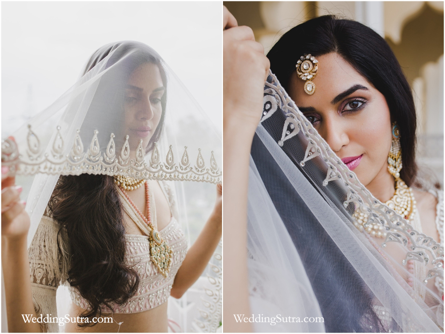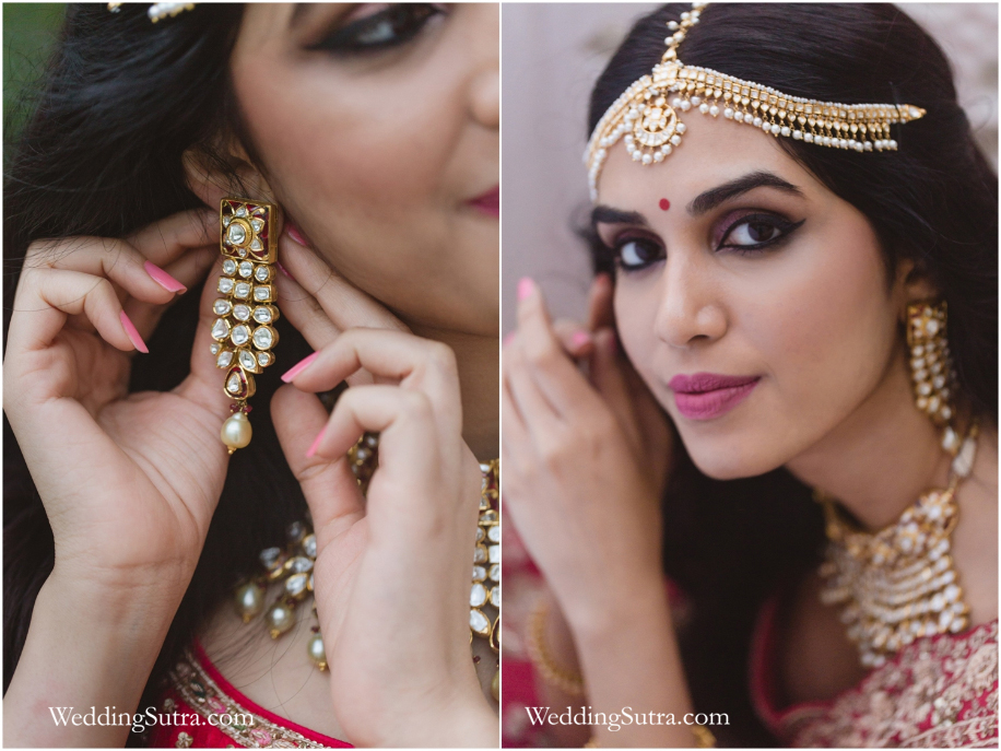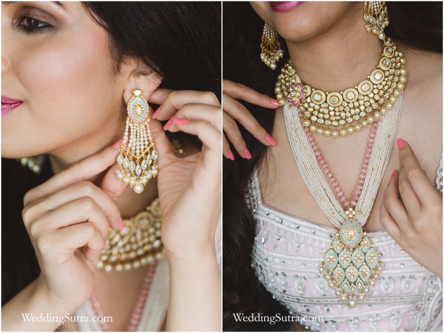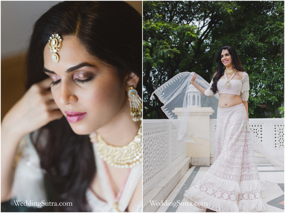 Sophistication, pure and simple. A lehenga of the lightest pink, weighed delicately with intricate threadwork and a blouse that featured statement fringed sleeves was paired with exquisite baubles from CH Jewellers. The kundan necklace was layered with a rani haar that was the perfect complement to her outfit. The strings of little pearls converged into a turquoise blue pendant that showcased fine floral detailing. Large earrings and a pretty maangtikka were elemental in endowing this look with grace. The makeup, though minimal, maximized the charm making her look nothing less than a million dollar bride.