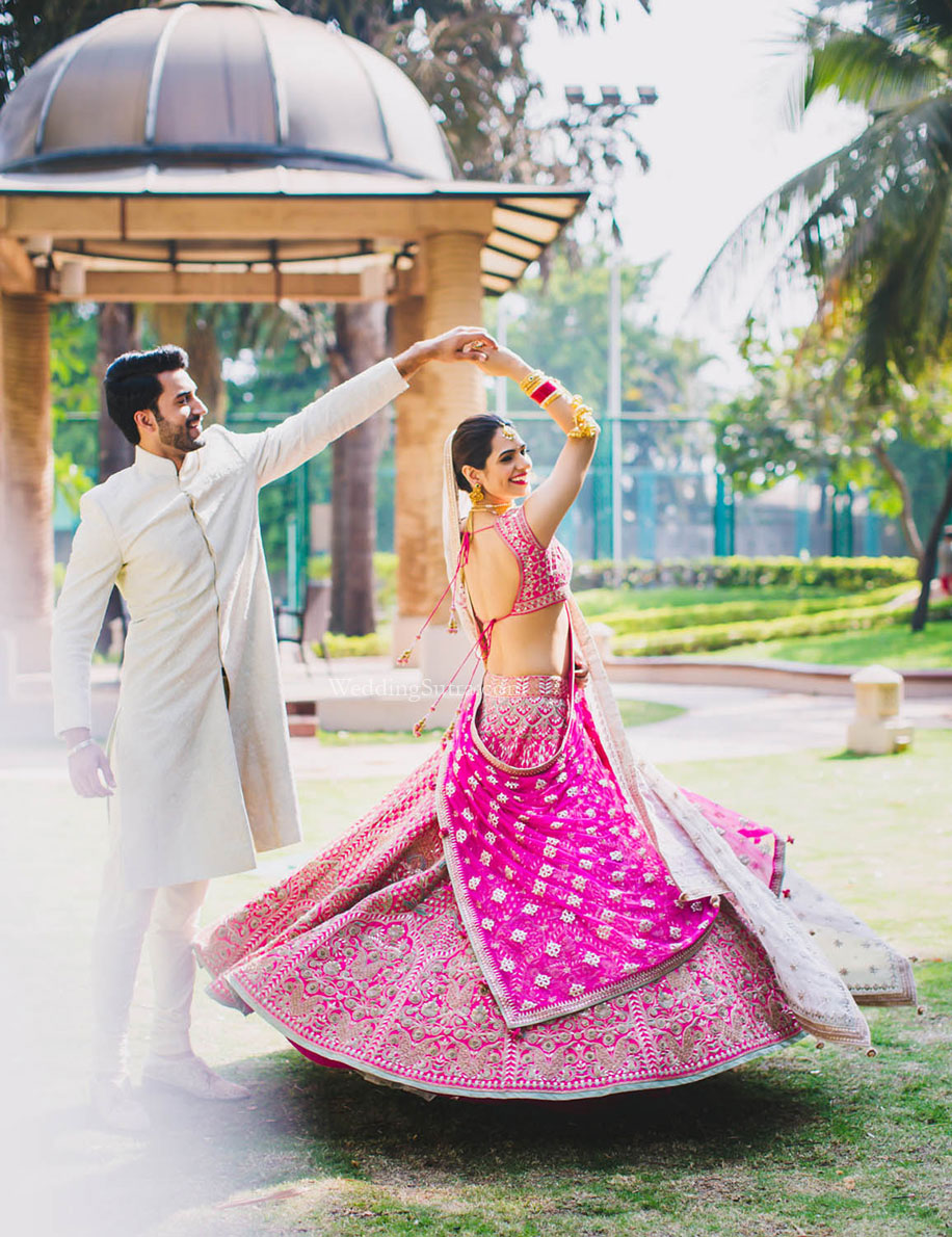 The significance of a Sikh marriage is epitomized in the ‘Anand Karaj’ (Joyful Union) ceremony where the bride and groom participate in a sacred ceremony in front of the revered Guru Granth Sahib. The bride, wearing a traditional pink lehenga with a beige dupatta draped over her head, was adorned with a magnificent glittering choker set by Tanishq Rivaah with precious kundan artwork. This stellar piece is teamed with a ‘raani haar’ (queen’s necklace) crafted in gold. She looked every inch a regal princess with her traditional ‘choodah’ (set of bridal bangles), ‘kadas’ (bracelets) and ‘kaleerein’ (danglers). Her ‘maang tikka’ (forehead ornament) and ‘nathani’ (nose ornament) by Tanishq Rivaah looked exquisite and completed her elaborate visage which was radiant thanks to gold eye makeup enhanced with kohl and a pretty pink pout. Watch the bride twirl in a stunning raw silk pink lehenga with intricate gota-patti embroidery by Anita Dongre, while the groom wears a subtle ivory sherwani also by Anita Dongre. The couple headed alongside each other to their ‘Laavan Phere’ where they sealed the bond of love forever.
