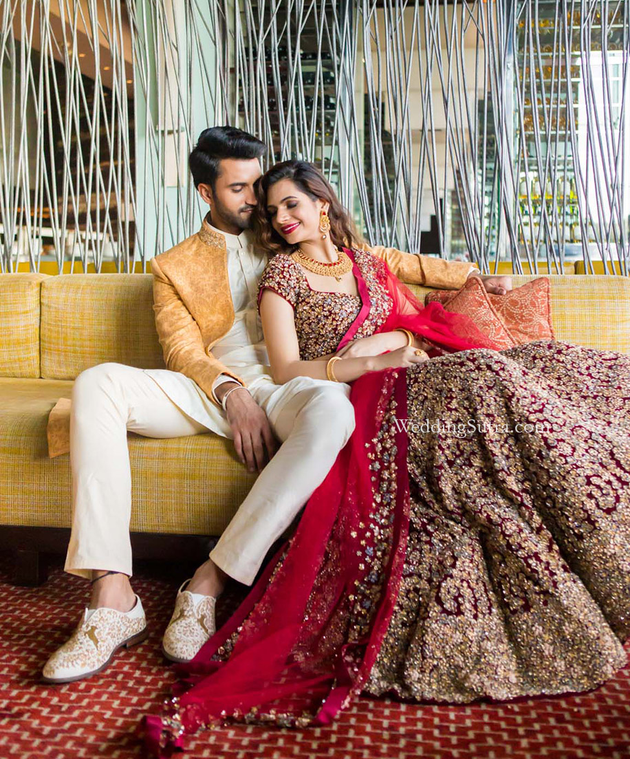 The new-age Punjabi bride chose a stunning statement-making antique finish choker by Tanishq Rivaah with intricate gold bead work perfectly complementing her bridal lehenga for the evening occasion. The gold ‘kadas’ (bracelets) with beautiful filigree work completed the reception look. She made a statement as she walked down in a heavily embellished maroon velvet lehenga by JADE alongside her groom dressed in a classic satin ivory kurta teamed with a gold self-embroidered long jacket by Anita Dongre. His eye-catching shoes added a bit of edginess to his sharply-cut ensemble. The bride’s makeup for this look was striking with a rich velvety crimson pout and smokey eyes, and her glossy styled locks added to her glam quotient.