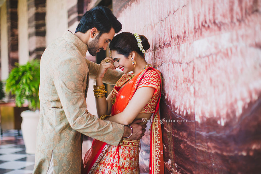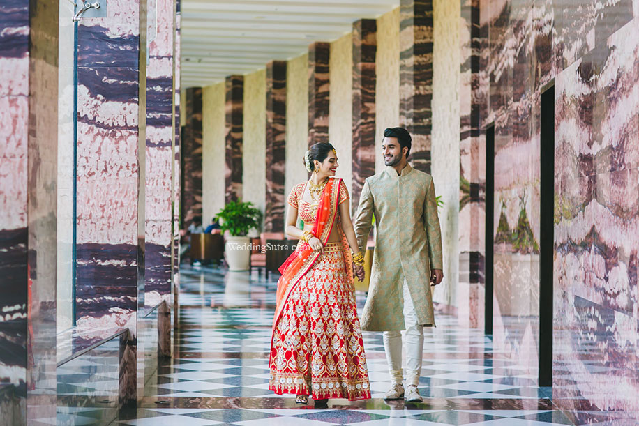The Telugu bride embodies the essence of Goddess Lakshmi and is bedecked in gorgeous gold jewellery inspired by temple architecture. The bride flaunted an exquisite floral choker by Tanishq Rivaah crafted with red and green enamel work, a medallion ‘haar’ (necklace), a pair of earrings, ‘maang tikka’ (forehead ornament) and a stack of gold bangles with rows of enamel work set in an intricate design. Dressed in an orange ombre lehenga by Abu Jani Sandeep Khosla with lightweight badla work, she walked down the aisle with her groom in a pastel green sherwani by Shyamal and Bhumika that was striking thanks to its elegant beige embroidery. Steeped in spirituality, the couple strode towards the mandap for their seven vows as per Telugu marriage rituals. The bride’s skin was kept flawless and glowing with a coral blush, red lips and bold winged eyeliner.