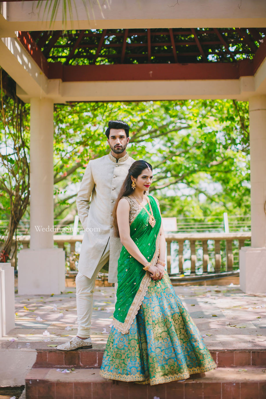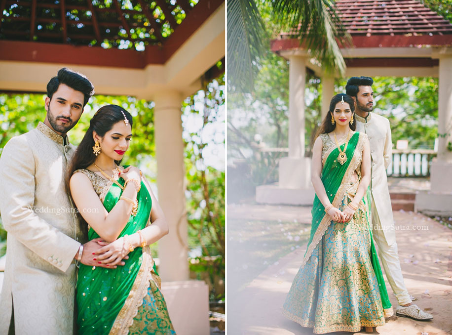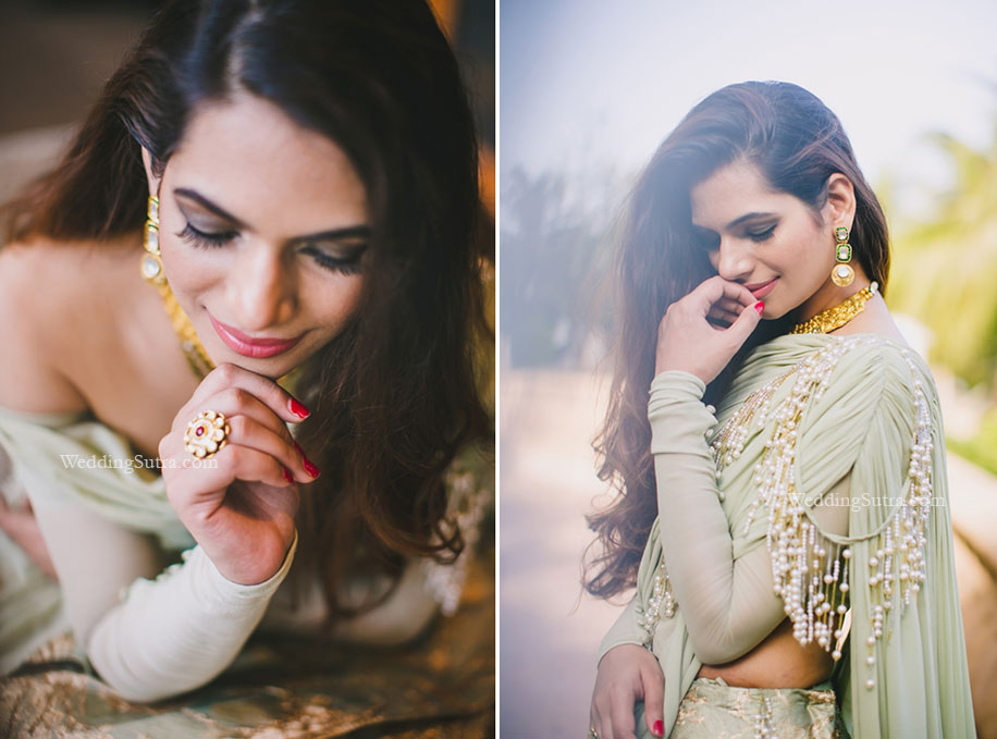 Rooted in her traditions, the bride wore a gold polki pendant necklace by Tanishq Rivaah with intricate diamond and stone work. She celebrated her new beginnings in an emerald green Banarsi silk lehenga by Bhumika Grover that was adorned with pretty gold accents. The groom kept it elegant in an ivory self-embroidered long jacket by Anita Dongra with minimal green piping work for the outdoor reception. The effortless reception look came together with tousled hair clipped from the sides and a bold red pout to complement the bridal ensemble.