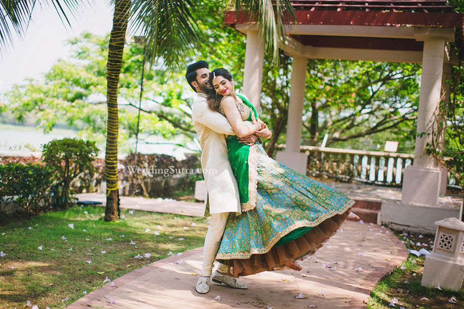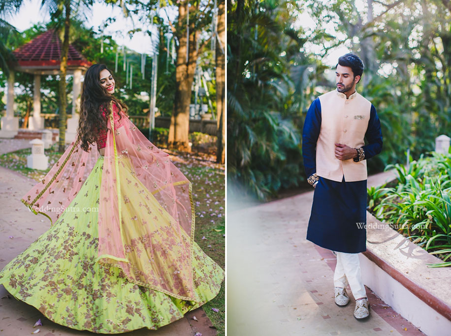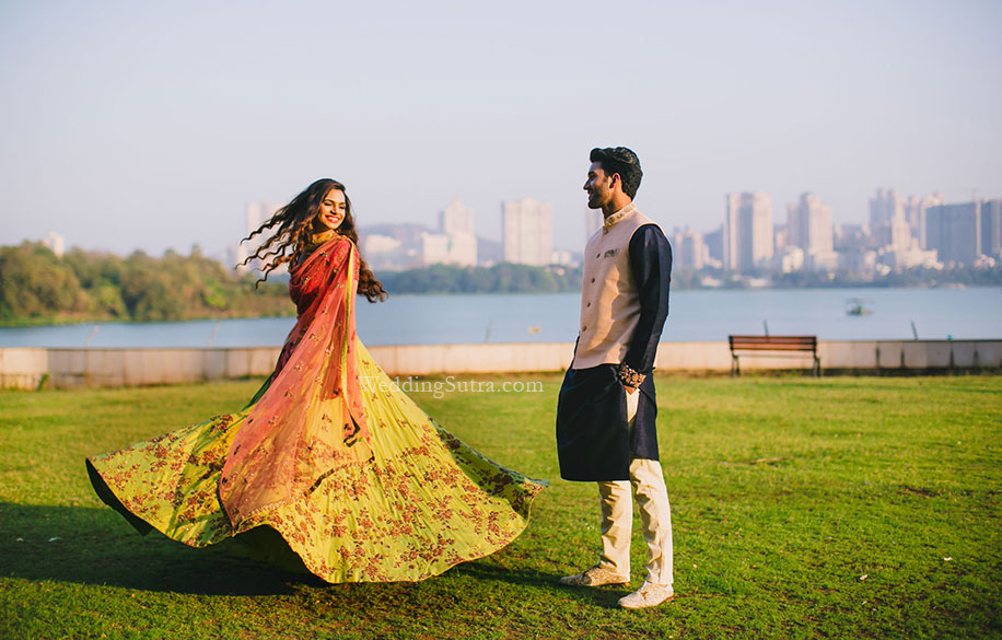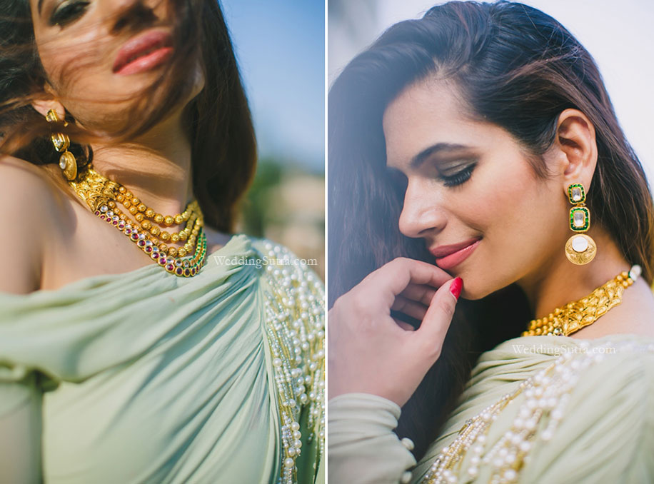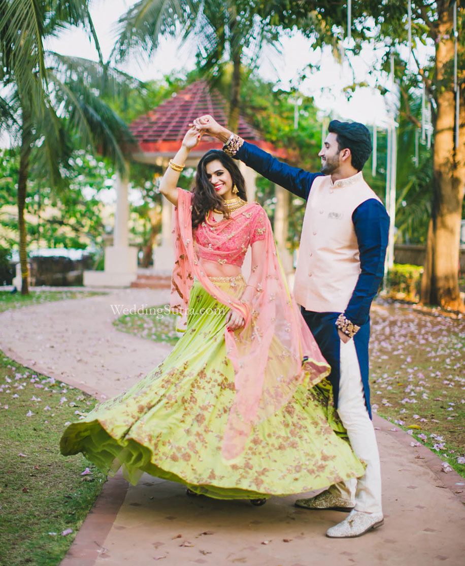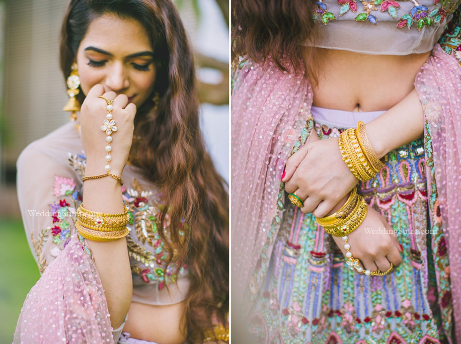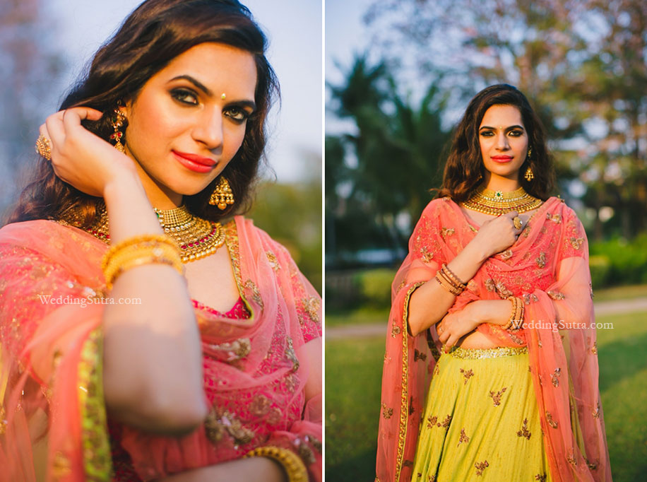 The mehndi is one of the most lively ceremonies at an Indian wedding. The bride adorned a Tanishq Rivaah choker and jhumkas with floral motifs and regal bead work to celebrate the beginning of the wedding festivities. Few stacked gold bangles with enamel work and a statement ring completed the elegant mehndi look. The new-age bride twirled happily in a lemon green and pink lehenga by Shyamal and Bhumika alongside her groom in an understated royal blue kurta teamed with a peach ‘bandh gala’ jacket. The bride looked joyous with flawless, a pink pout, flushed cheeks and bouncy, wavy hair that was perfect for the effervescence of a mehndi function.
