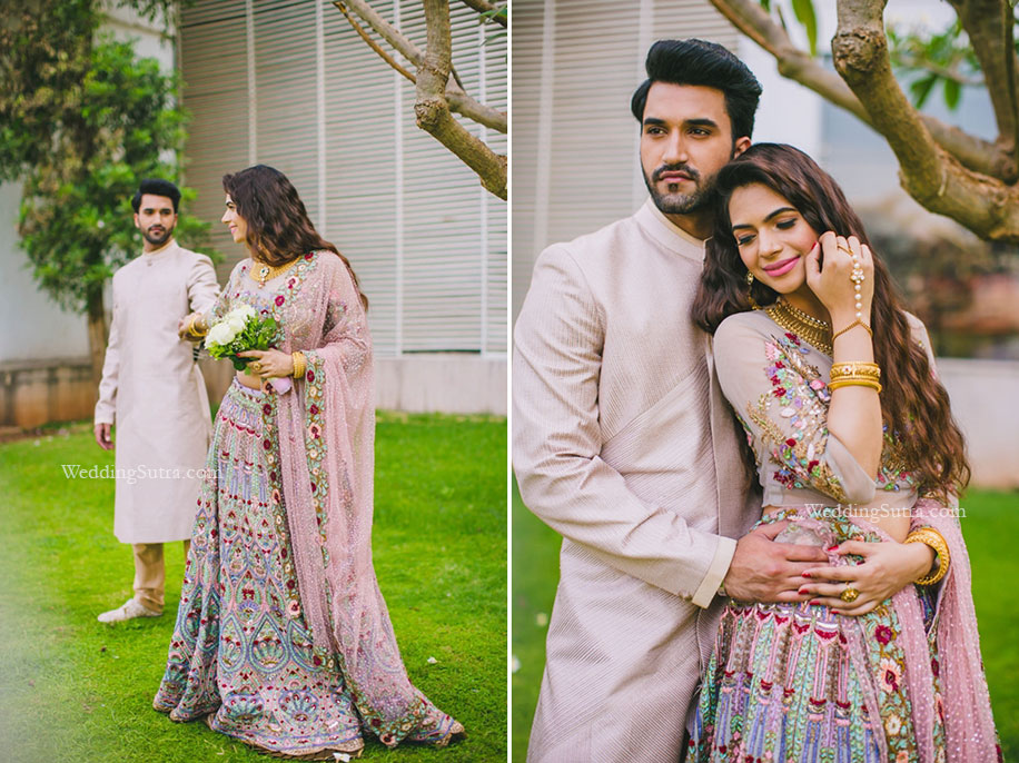 The modern bride chose a contemporary touch to celebrate her big day with a paneled glass kundan studded gold choker with jhumkas by Tanishq Rivaah redefining a statement trousseau. She also stacked two statement gold kadas to complement the ethereal powder blue lehenga by Manish Malhotra with floral thread work. The groom wore an à la mode blush color sherwani by Manish Malhotra with delicate thread work. The dewy skin and baby pink lips along with soft curls in the hair added to the bride’s graceful cosmopolitan ‘pheras’ look.
