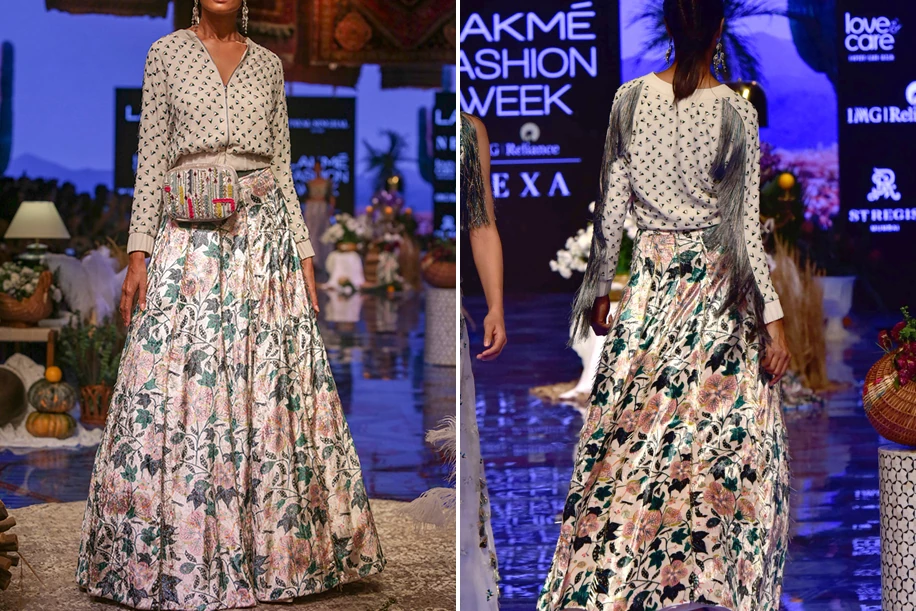 Floral print lehenga and bomber jacket set with embroidered bag