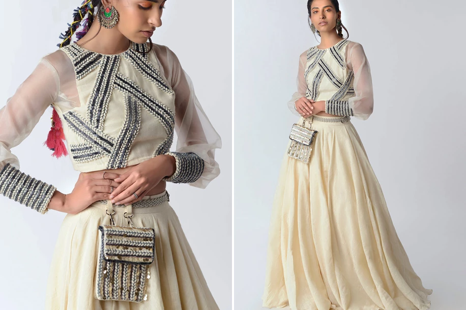 Off white, organic cotton lehenga set with sequin and cutdana embroidered belted bag