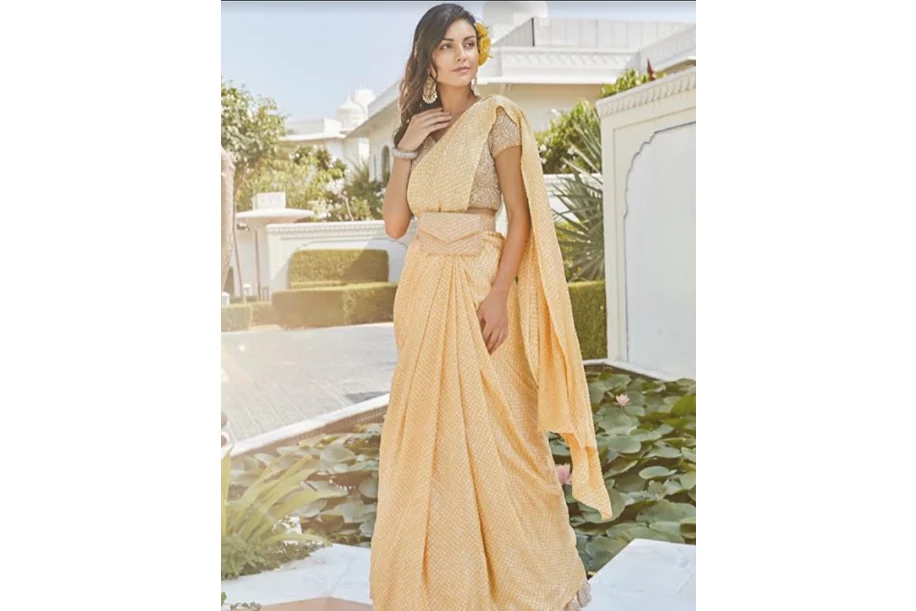 Pre draped yellow saree set with embroidered belted bag