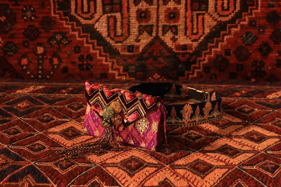 Hand Stitched velvet, ikat, and Kashmiri thread embroidered bag