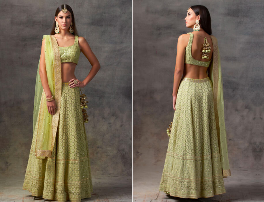 Pista Green lucknowi chikan lehenga with sequin and pearl work paired with a net mukaish dupatta by Avnni Kapur