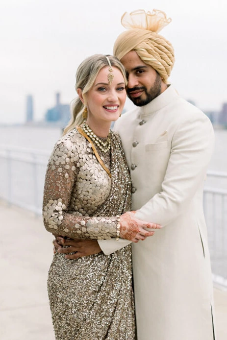 Ayesha chose a rich ivory and gold saree by Sabyasachi Mukherjee along with a gold veil for her Nikaah in New York.