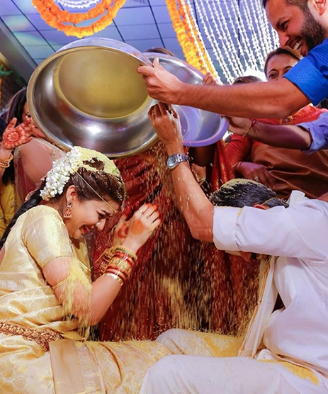 Telugu Actress Swathi Reddy wore a beautiful silk gold saree for her traditional wedding.