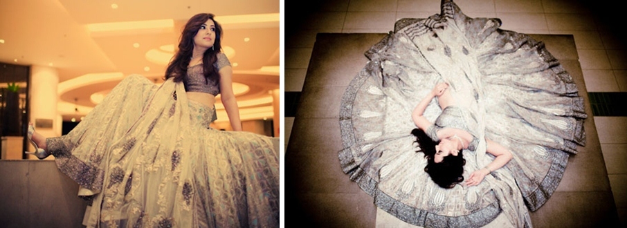 Contemporary lehenga by Shantanu & Nikhil with a voluminous sheer skirt with blue, silver and light lilac patterns and white underskirt giving a white/silvery look teamed along with a metallic silver blouse and net dupatta worn by bride Shradha Bhagchandani.