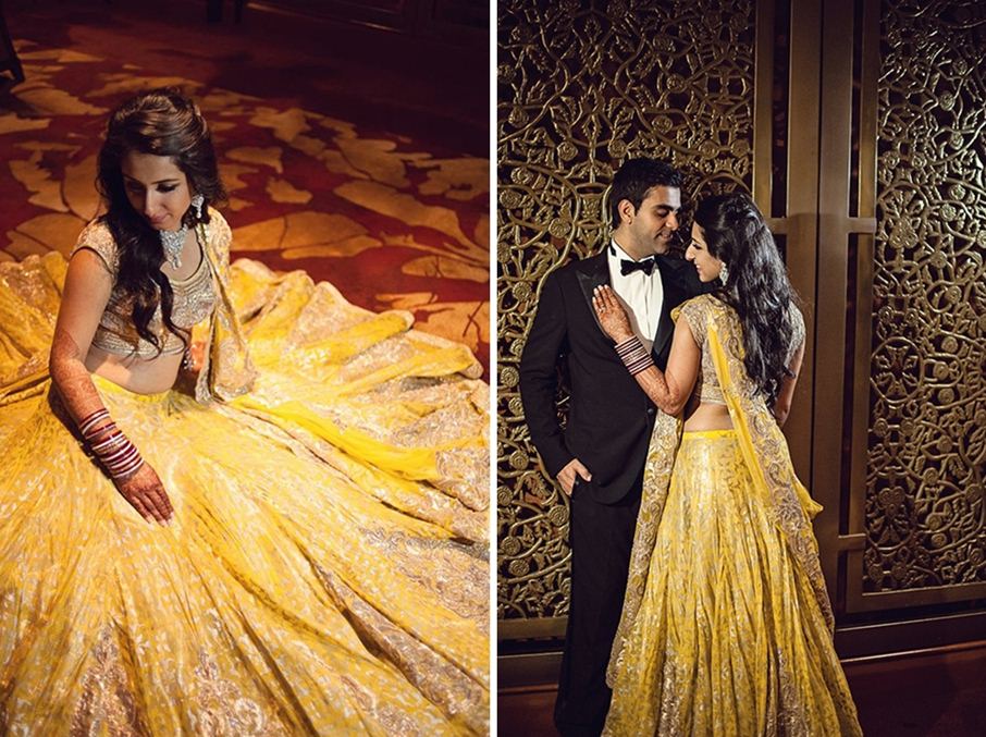 A customized yellow and gold motif lehenga by designer duo Shantanu & Nikhil for bride Sneha Adnani’s reception.