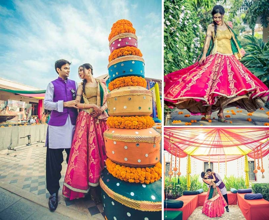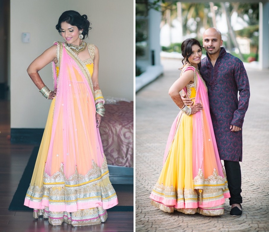Simple and chic candy pink and yellow lehenga for the outdoor mehndi ceremony designed by a Dubai based designer for bride Neetu Sajnani.