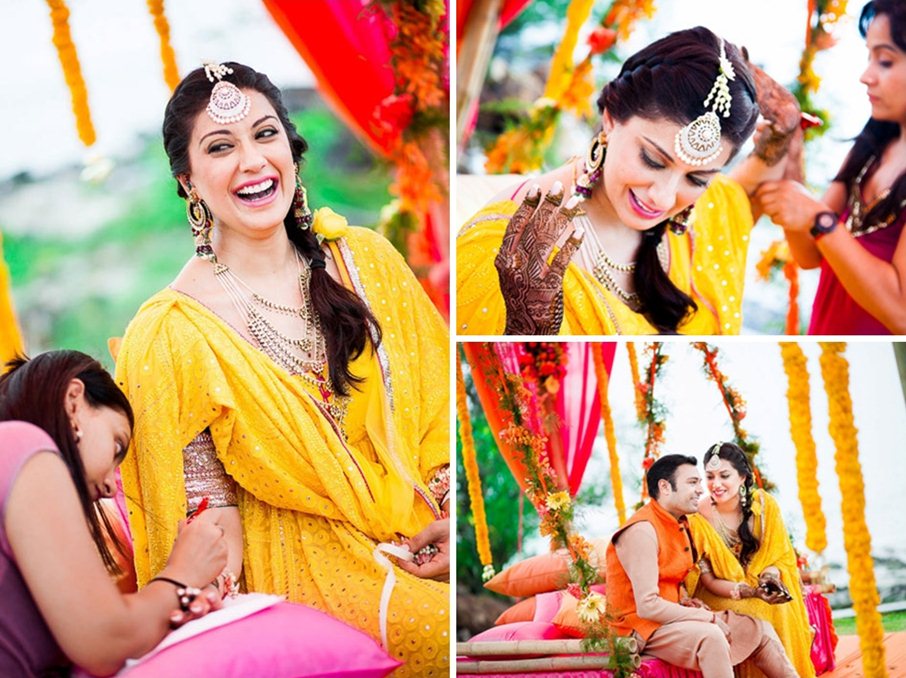 Bring cheer to the mehndi function by the poolside with a bright yellow anarkali designed by Nidhi Tholia for bride Aushima Sawhney.