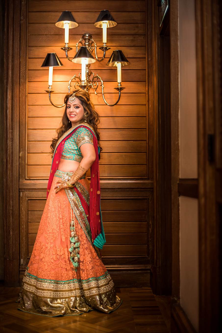 Choose an elegant pastel pastel hue for one of the pre-wedding functions like bride Poonam Jeswani’s peach and pastel teal blue lehenga by Sabyasachi.