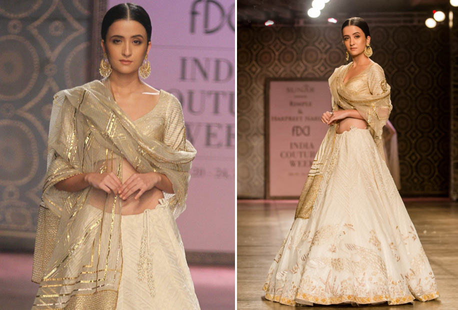 This stunning beige and white lehenga by Abu Jani and Sandeep Khosla from their Mehjabeen collection exudes that magical perfection which is what a high-glamor summer wedding look should be all about. The shimmery elements add glamor, and the beautiful cut adds comfort and contemporary charm to the outfit.