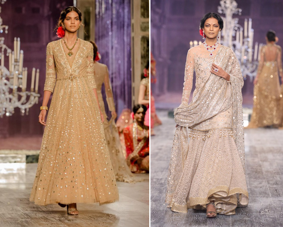 This gorgeous lehenga by designer Manish Malhotra is straight out of an avant-garde dream. With a feathery hem, sheer neckline and a nude canvas adorned with glittery, understated matching embellishments and silver thread embroidery, this ensemble is perfect for brides who want a modern look that exudes drama and elegance.