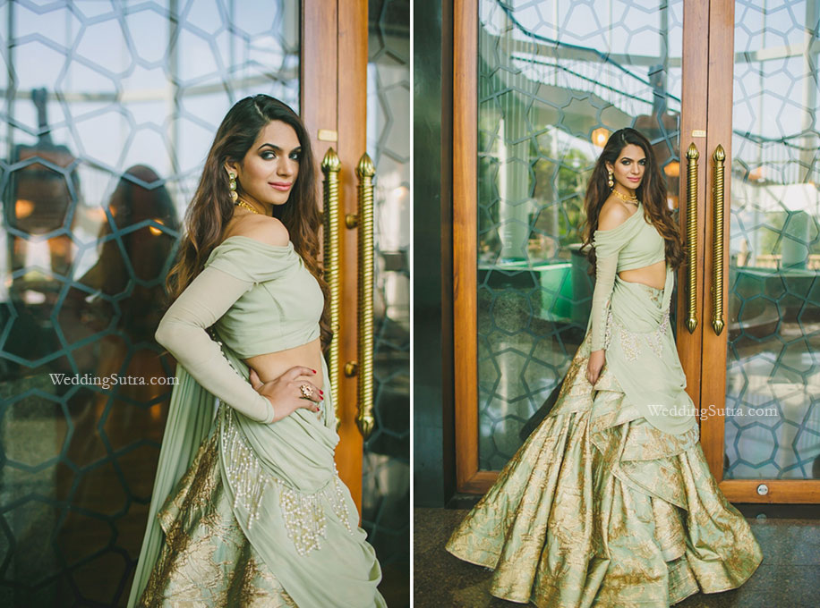 Rich, heavy and regal, this light green lehenga by Gaurav Gupta impresses with its ruffled skirt that is rich with gold threadwork, which contrasts interestingly with the lighter blouse and dupatta, adorned with pearls and sequins. This makes for an interesting contrast of textures and design elements.