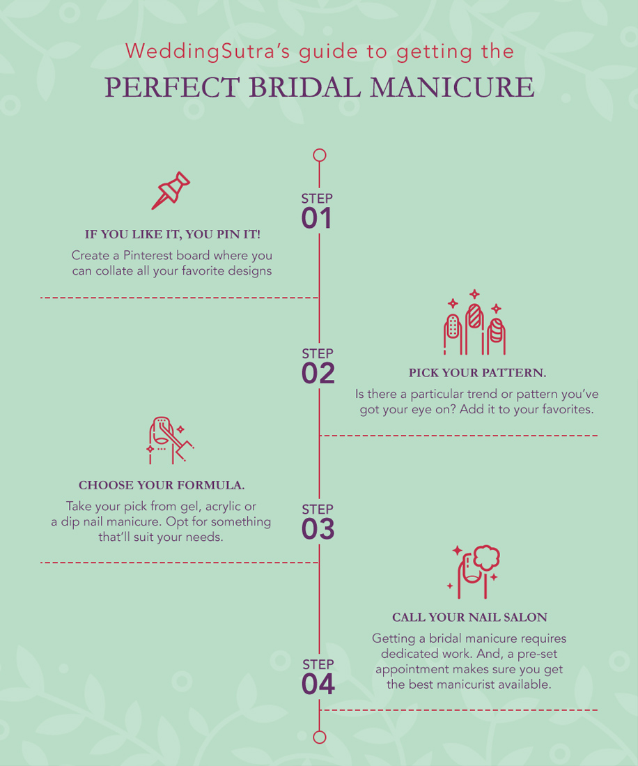 After countless trials and hours spent on the stylist’s chair, the bride finally decides on her hairstyle and makeup look, jewelry, and the pièce de résistance, her wedding outfit. However, amidst all the chaos of planning a wedding, more often than not, a bridal manicure ends up being the last thing on the list. This, then results in a hurried visit to the manicurist where a nondescript choice is made on the spot from a series of pre-set designs.