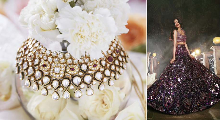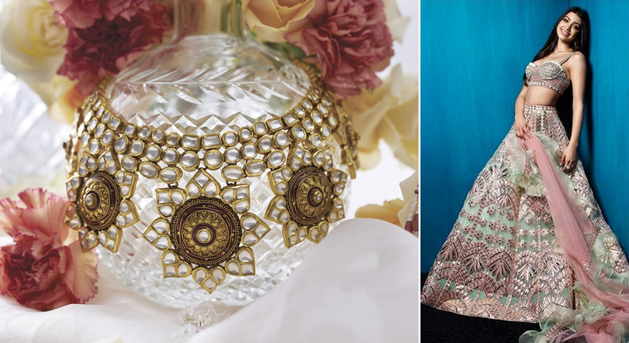 The cocktail party is to get you in the mood before your big day arrives. The key is to enjoy the freedom to dress as fabulously as you like without the restraints of formal festive wear. All you need is to be able to dance, let your hair down and socialise. This cocktail-party choker from Rivaah by Tanishq with its sunflower inspired accents is the perfect piece! The finely cut crystals will catch the light, it’s versatile enough to be used across ethnic, fusion or even western wear but we think the neutral kundan set in gold is really elegant with the pink and green tones of this Falguni Shane Peacock outfit. Teasingly traditional, the choker actually resonates beautifully with the contemporary lehenga and bralette-choli. If you ever wanted to make a statement as a bride, this is the perfect way to do it!