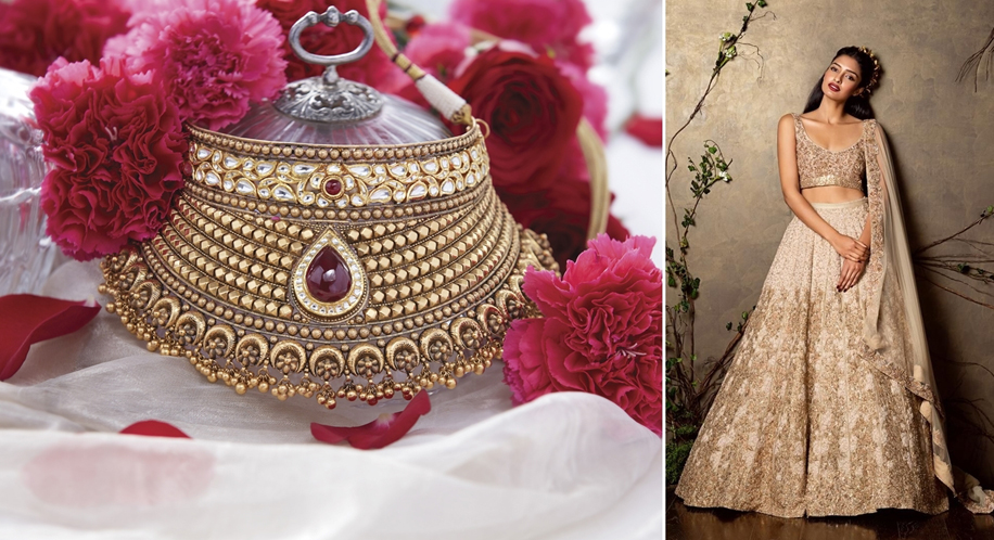 While every bridal look is greater than the sum of its parts, two pivotal style elements for the ‘Modern Bride’ are a gorgeous lehenga and a statement neck piece. Perhaps no other neck piece works as well as a choker with a lehenga. It accentuates the neckline, shows off the collarbones, frames the face and resonates beautifully with the lehenga without merging into the details of the blouse.