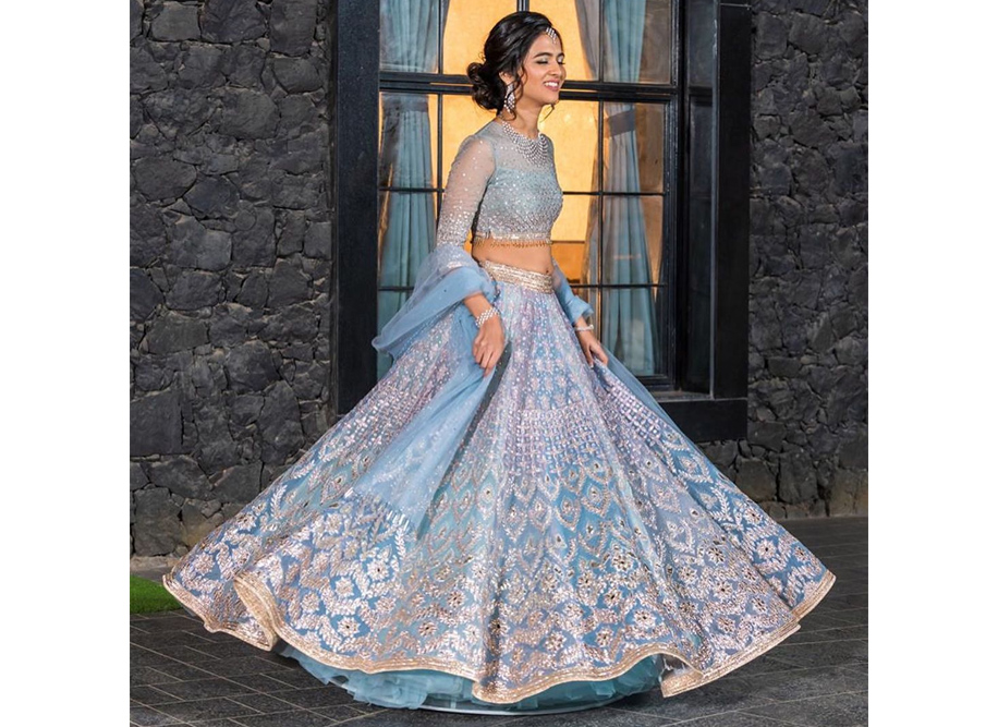 Lakshmi chose the path less taken and donned a deep steel grey velvet lehenga by Sabyasachi Mukherjee with a heavily embroidered blouse and sheer dupatta for her wedding reception in New Jersey.