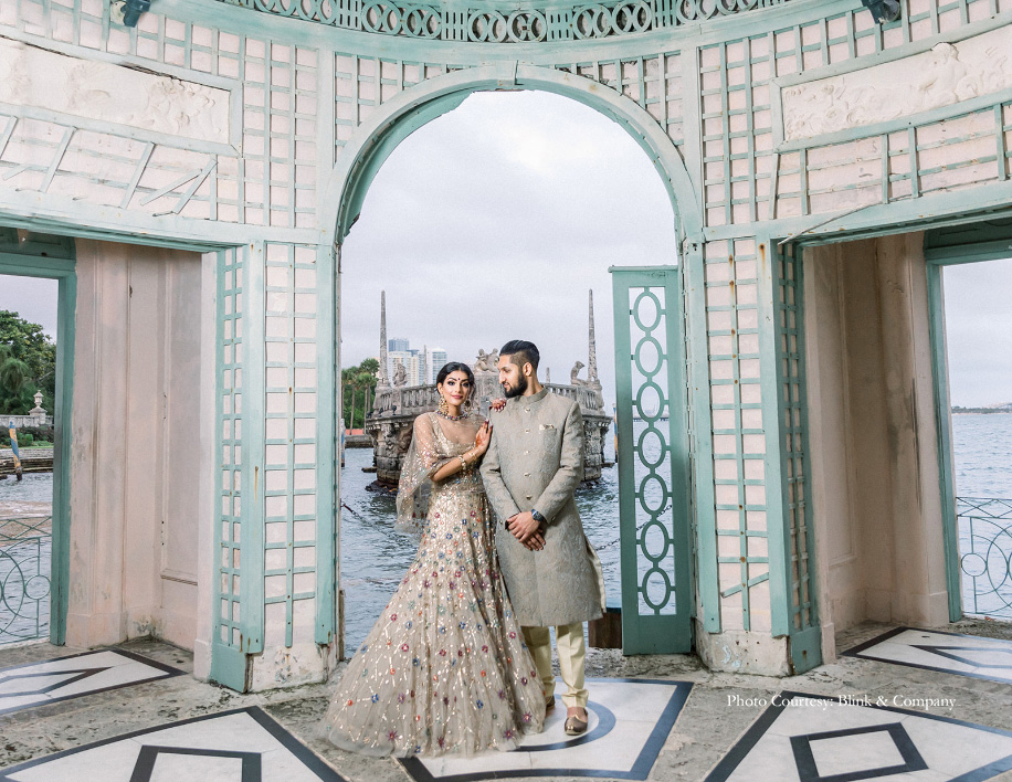 At her fairytale wedding in Texas, Natasha’s self-designed dreamy lehenga under her label bZAI by Natasha Arora featured baby pink vegan leather crafted into hundreds of florets on the skirt and paired with beadwork blouse. The look was fresh and perfect on this gorgeous bride.