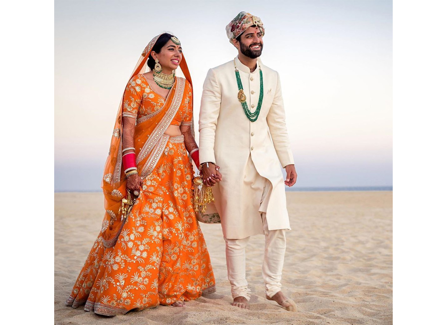 The color of sacred fire and flowers, call it orange or saffron or tangerine, when you wear it, it suffuses your skin with an incredible glow. Now try pairing it with silver jewellery and you can set the night on fire. Aastha carries off her exquisite orange lehenga by Anita Dongre like a fierce goddess, rivaling the sunset, at her beautiful beach wedding in Mumbai.