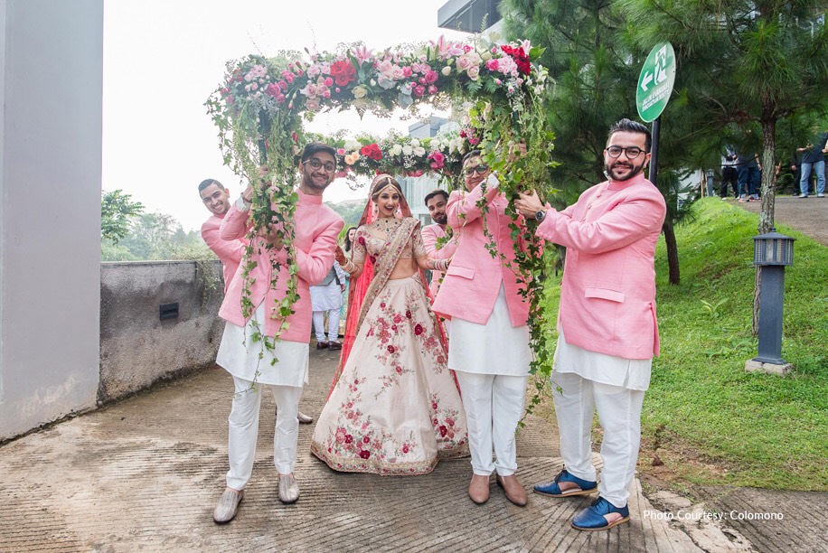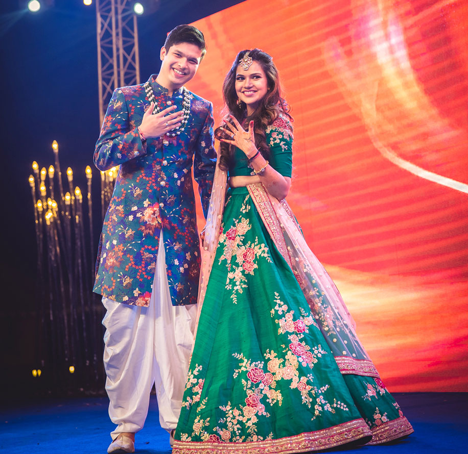Actively working on projects to break gender stereotypes, Zinal designed her wedding lehenga with a soft grey fabric featuring geometric and floral designs which complemented the groom’s pink sherwani.