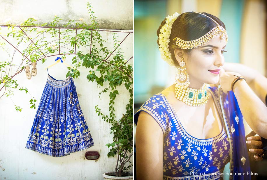 A fashion fairytale unfolds with this exquisite royal blue gota patti lehenga. Bride Shailja looks her traditional best in this stunning creation by Anita Dongre for her wedding in Allahabad.