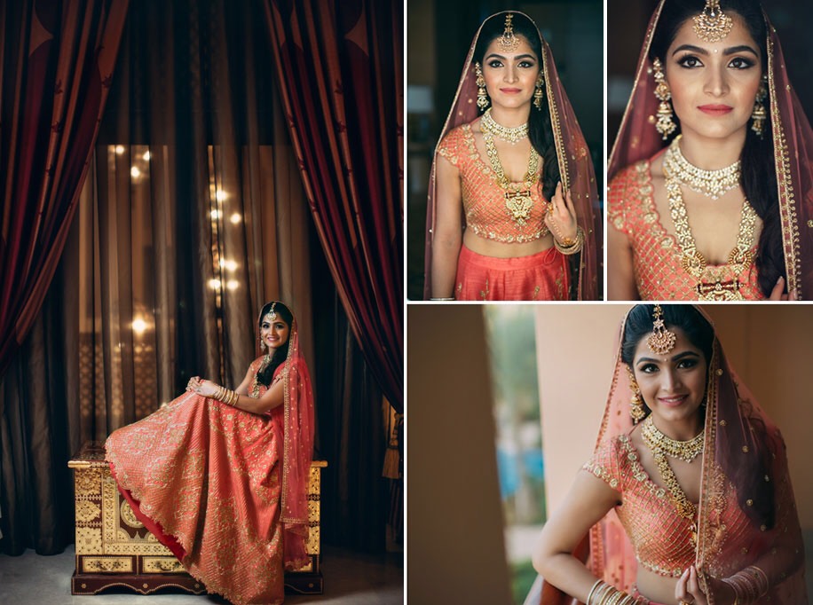 Peaches and cream – the light, complexion enhancing tones of this lehenga will make you wonder why you ever considered red. Bride Ankita looks traditional as well as trendy in this creation by Anita Dongre with the right amount of bling.