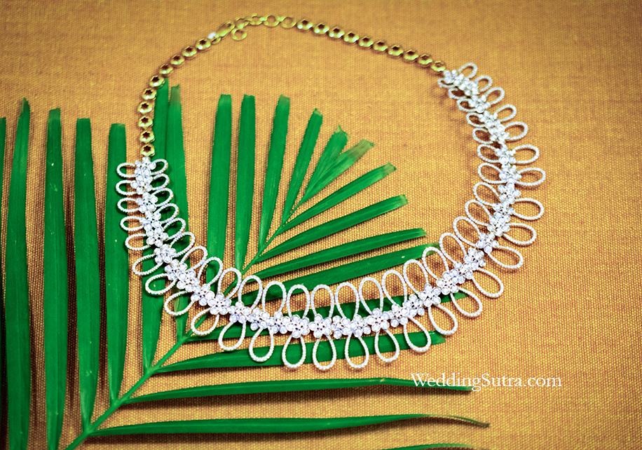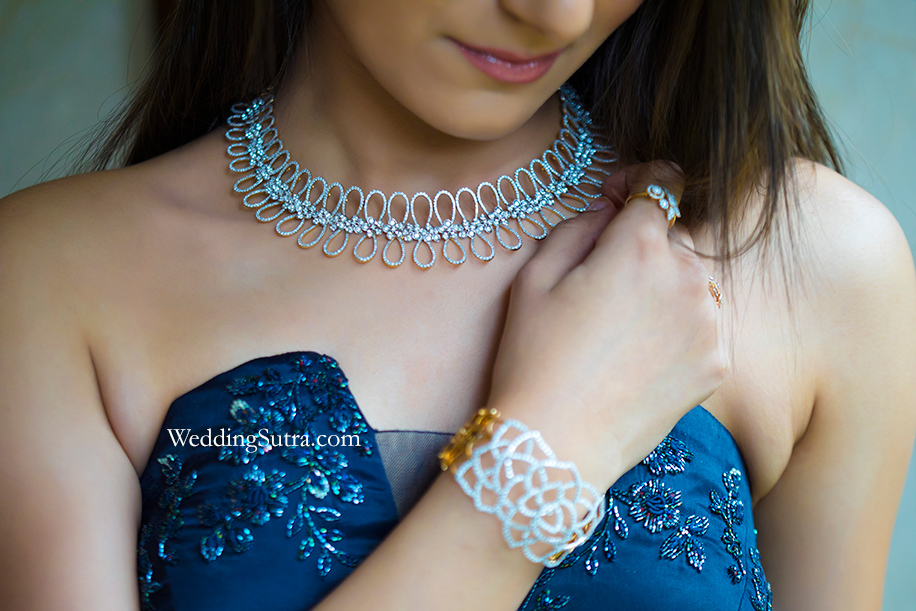 A delicate design that holds the attention with its artistry makes for captivating jewellery. The ORRA necklace that Vishakha wore is reminiscent of intricate lace and sits gracefully on her neck. A row of brilliant diamonds fringed by loops on either side adds a touch of flamboyance. Following through on the daintiness, the bracelet evocative of a blooming rose, completes the look.