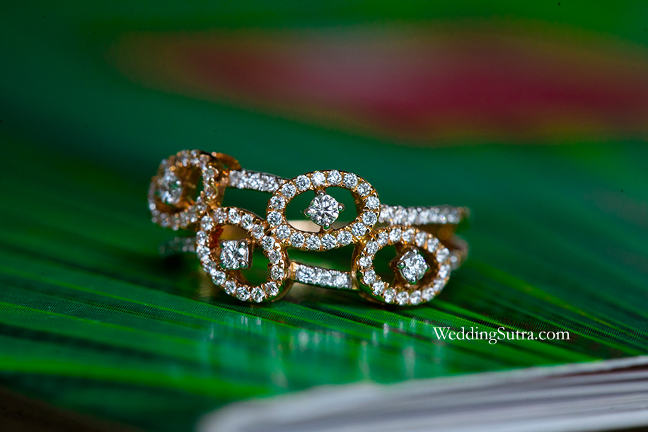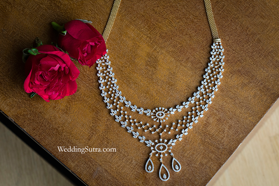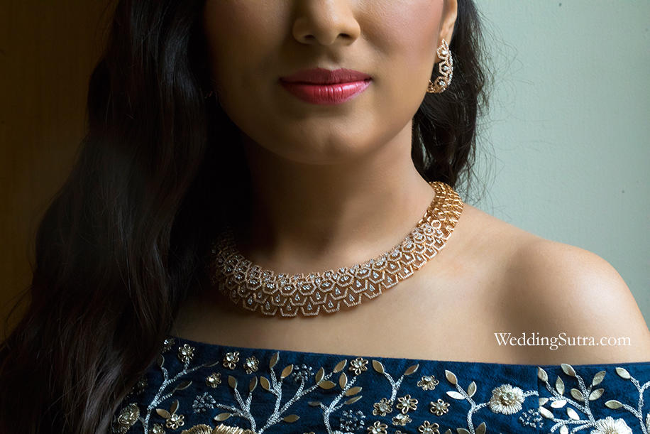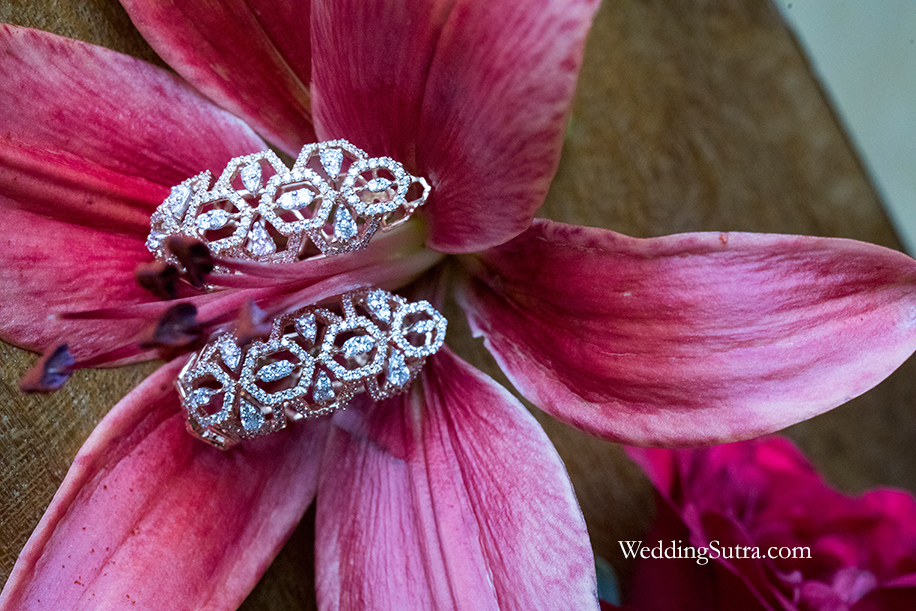 While designs inspired by nature and those derived from geometry are seen as styles distinctive of each other, Janisha’s necklace by ORRA marries these disparate influences in contemporary perfection. The honeycomb pattern creates the perfect balance between the motifs. Within each cell sits a single drop-shaped diamond, the hollow spacing capturing the eye. The set is matched with rings that align with the theme. On one hand, she wears a cocktail ring shaped like a rose and the other displays a ring that features contemporary liner design encrusted with diamonds.