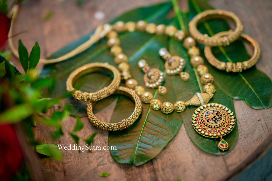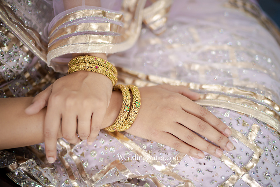 The bridal lehenga in blush by Nivedita Saboo went perfectly with the jewellery. The exquisite golden hand-embroidered detailing against the muted color of the ensemble made it an ideal pick for a night of dancing. To complete the look Manasvi put on two pairs of handcrafted kadas and was ready to bring on her best moves.
