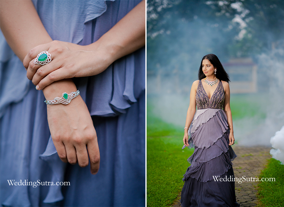 Manasvi matched this gorgeous necklace with an elegant yet playful gown by Nivedita Saboo. The outfit balanced its shimmering bodice and a plunging neckline with a ruffled ombre skirt. The beauty of the look was elevated by adding a meticulously crafted diamond and emerald bracelet, ring, and, earrings.