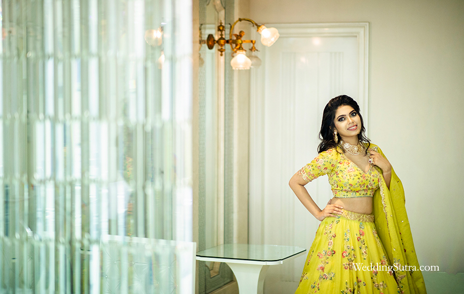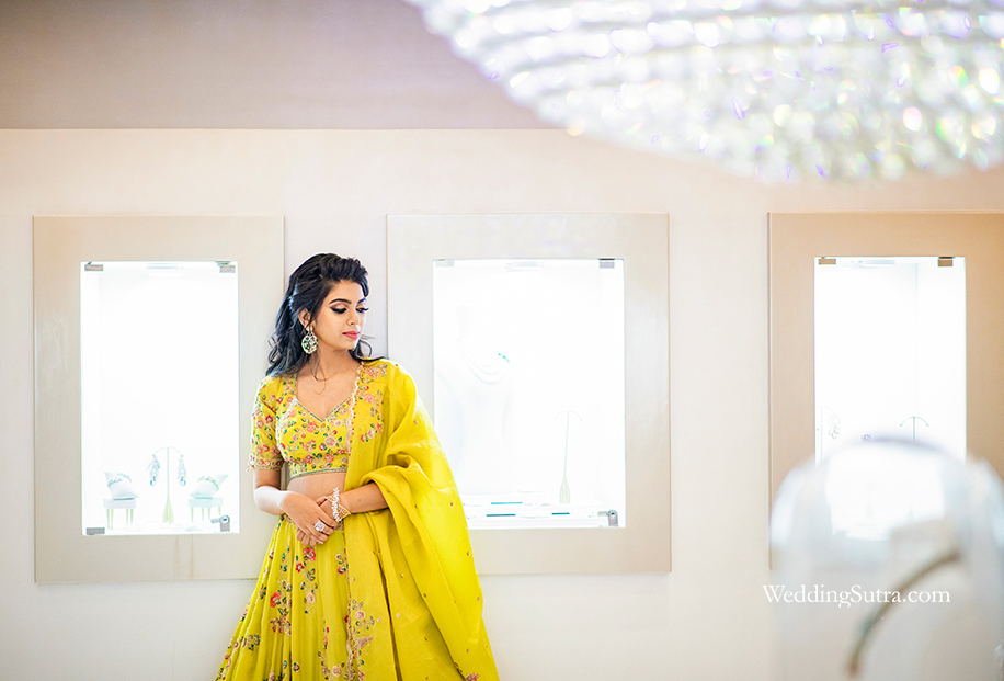 The dazzling diamond jewellery paired splendidly with the yellow lehenga by Dolly J that complimented the design of the necklace with its floral motifs. Contrasting threads of peach blue and green traced patterns embellished with sparkling sequins. Makeup artist Hemal Thakkar gave Kavya a fresh glow, and paid close attention to her eyes by highlighting her brows, and completing the look with fuller lashes and a hint of shimmer around the corners of her eyes.