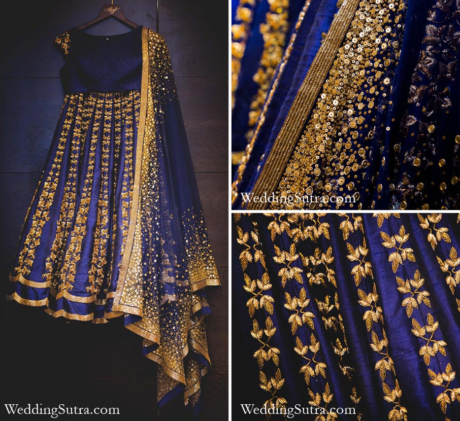 This midnight blue lehenga with nakshi zardozi and antique katdana embroidery with a quilted blouse is both regal and contemporary. Offset the ensemble with traditional jewellery by Manubhai Jewellers.