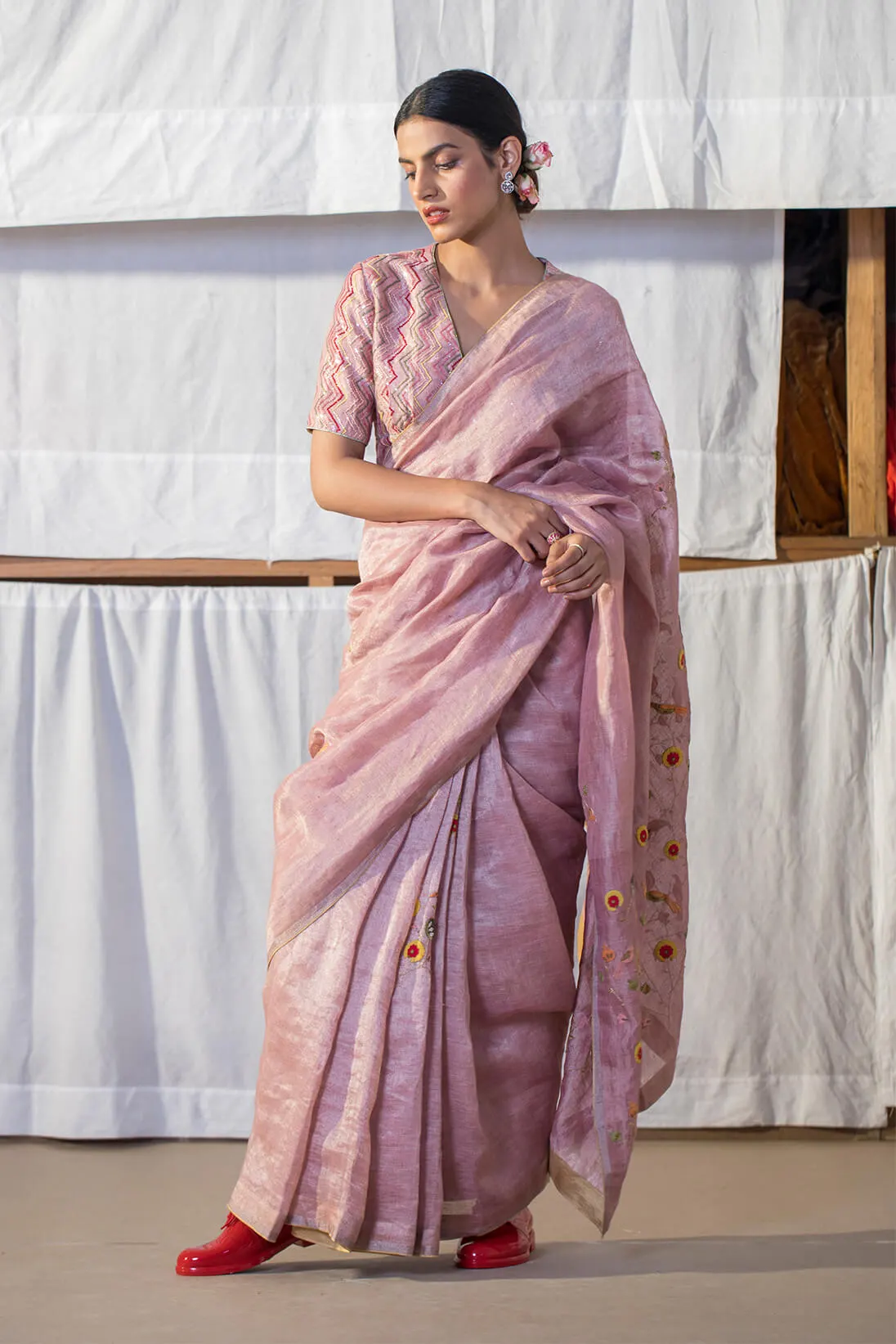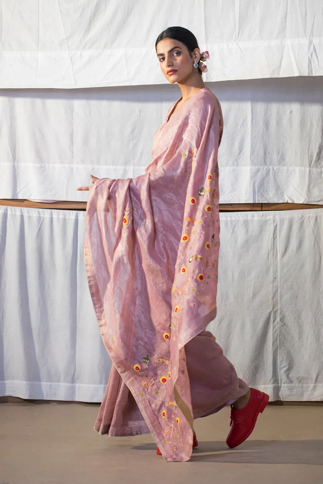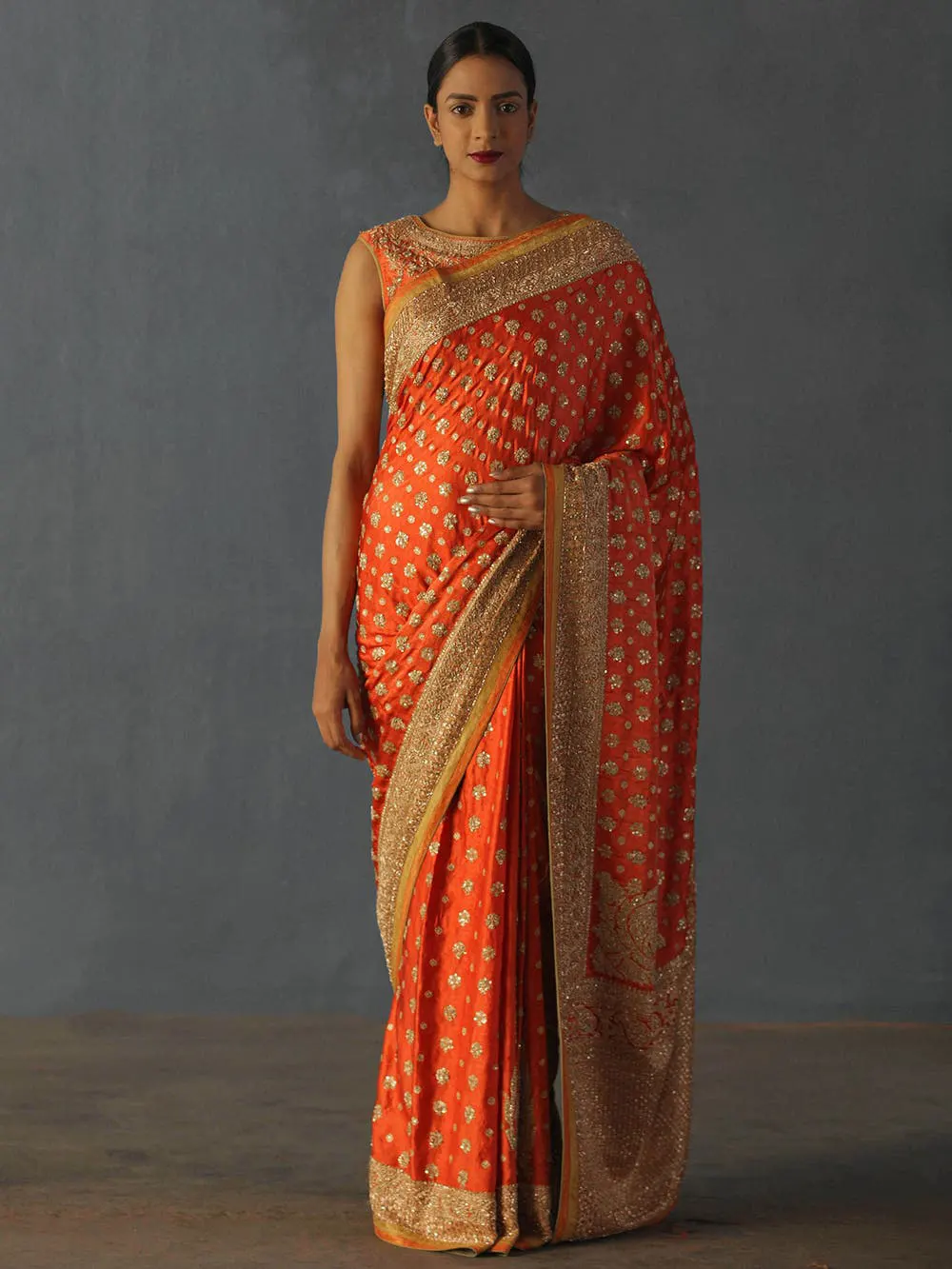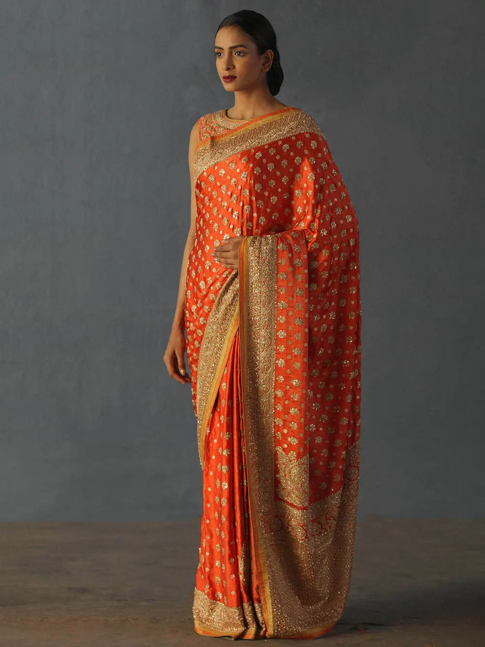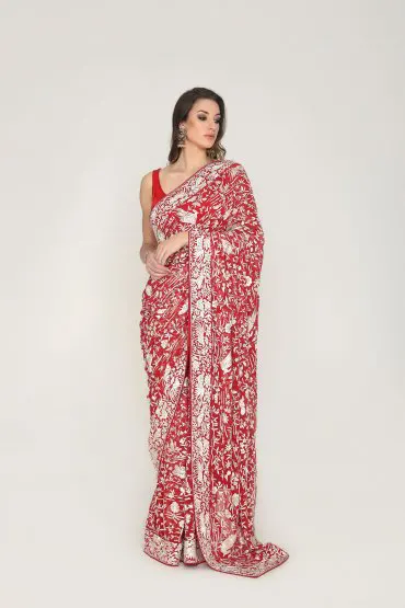 Coral Zardozi Silk Saree by Ritu Kumar