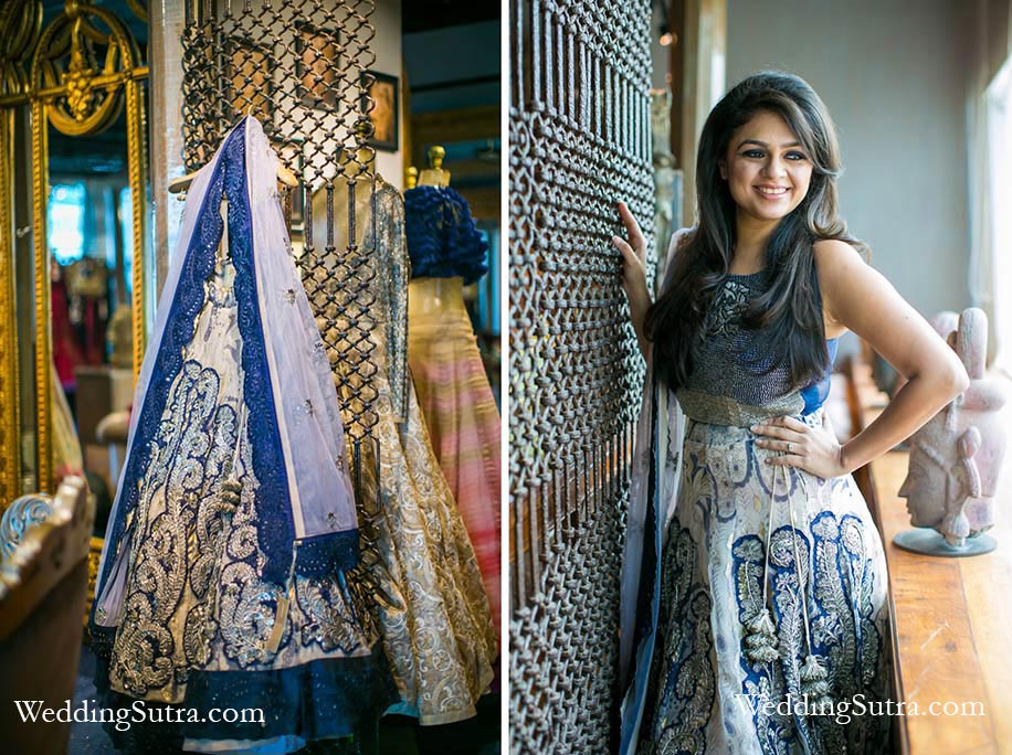 This pretty midnight blue cape choli lehenga by SVA Couture is just what you need to create a dramatic impression. With delicate and pretty motifs, you are bound like no less than a diva on your mehendi.