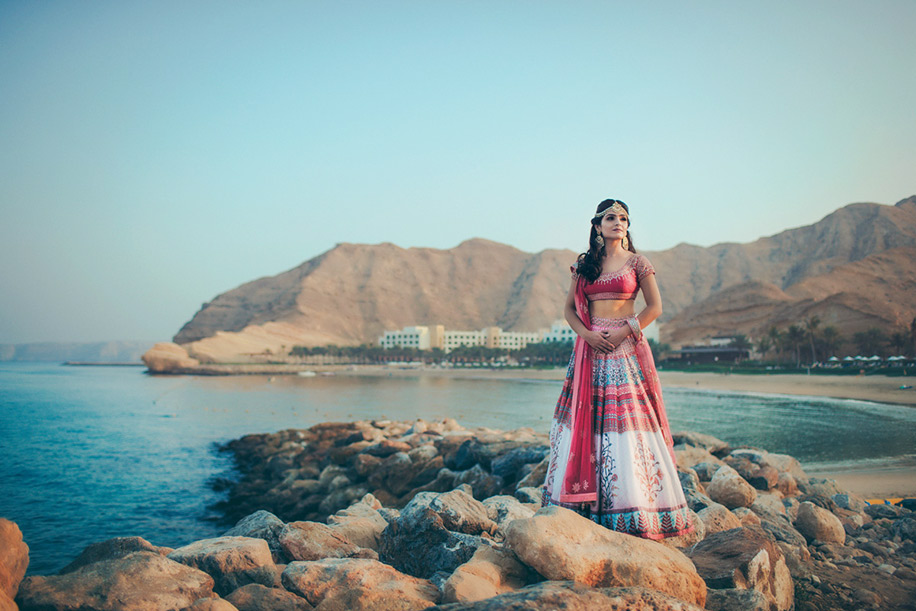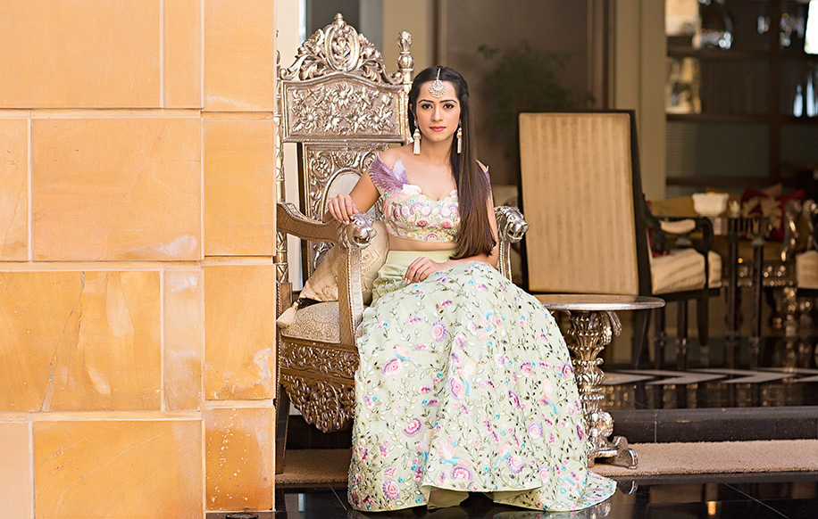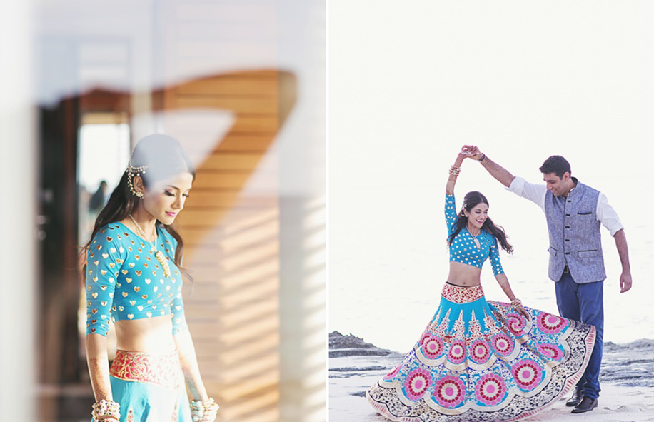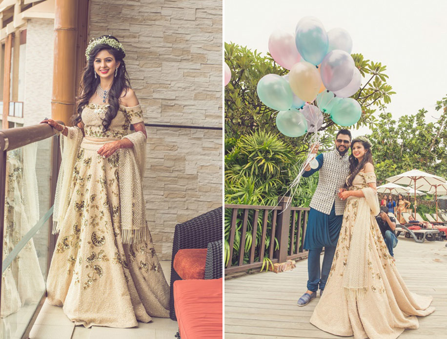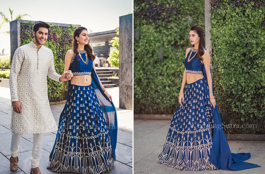 Want something girly yet gorgeous? The fairytale princess look gets an ethnic makeover with this bright floral print lehenga by Anushree Reddy with an off-shoulder blouse. It is ideal for a bride who wants to look like modern royalty as she twirls around at her mehndi party.