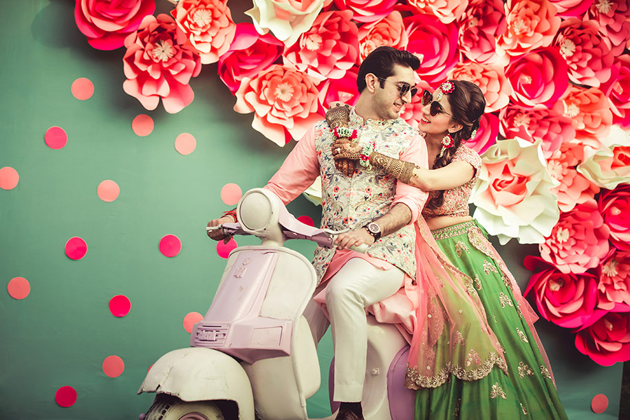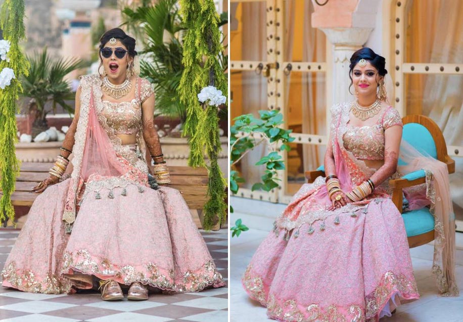 Green and pink ensembles are popular for mehndi functions, and the best part is that the variations of these colours lend themselves to endless pairings. This blush green lehenga by Anushree Reddy is playful and lightweight, and the net dupatta adds that extra festive flair.