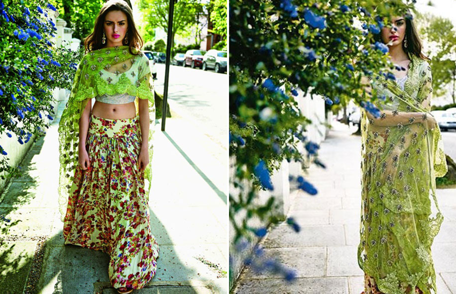 If you fancy bright colors and are not afraid to flaunt bolder silhouettes, this ultra-mod ensemble by Monisha Jaising is perfect for you! It’s bohemian, versatile and oh-so-cool with a white blouse, pretty dupatta with green lace border and shiny motifs, and a floral print skirt.