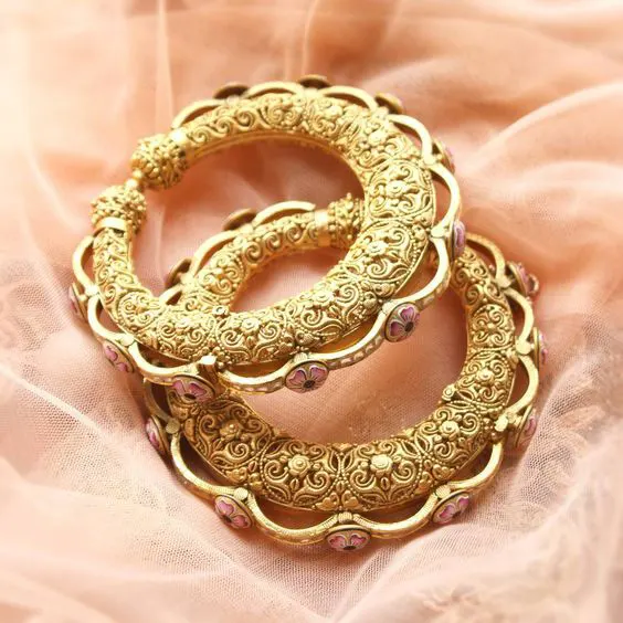 An essential for every Indian bride, gold bangles or choodiyan come in a variety of styles and sizes, but are usually adorned with floral motifs.