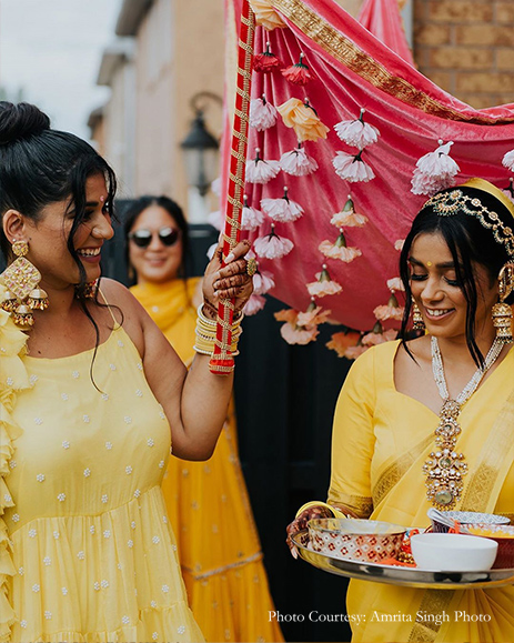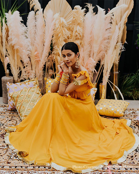 The Maiiyan ceremony carried a rustic vibe, for which the bride wore a yellow hand woven banarasi saree. The bridesmaids all made for a stunning vision in various yellow outfits from the new collection of the bride’s label. Breezy and bohemian in different shades, Candy wore the mulmul set and Simmy donned the baby-doll sharara set.