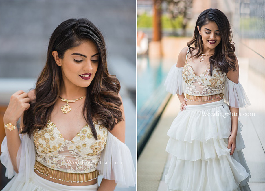 Simran opted for a white ruffled lehenga with a cold shoulder blouse by Label D. The solid color outfit was enhanced by golden floral embroidery on the blouse that was fringed with golden tassels. For the final finish, her hair was styled in soft curls that tied the whole look together beautifully.