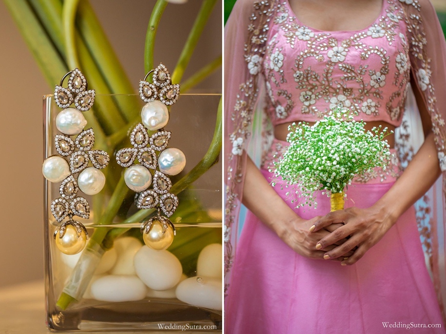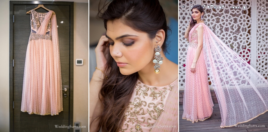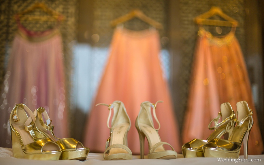 The morning began with the bride and her bridesmaids start prep in the JW Marriott signature robes. Our photographer, Rajesh Dembla was at hand to capture the chatter and stifled squeals as the girls picked their outfits from a chic collection by KALKI Fashion in complementary hues of blush and pink. Curated with a theme, each outfit had an element of glamourous glitter and shimmer incorporated into the embroidery and finishing.
