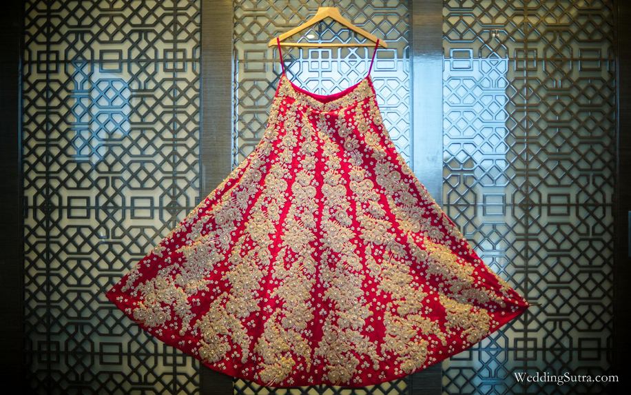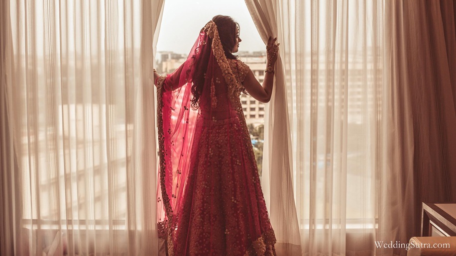 Crimson red lehenga for bride-to-be Amrita by KALKI Fashion