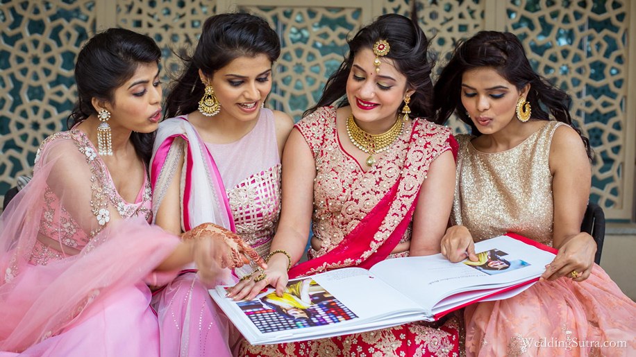 Bride-to-be Amrita flips through ‘Style Unveiled’ by Canvera along with her bridesmaids